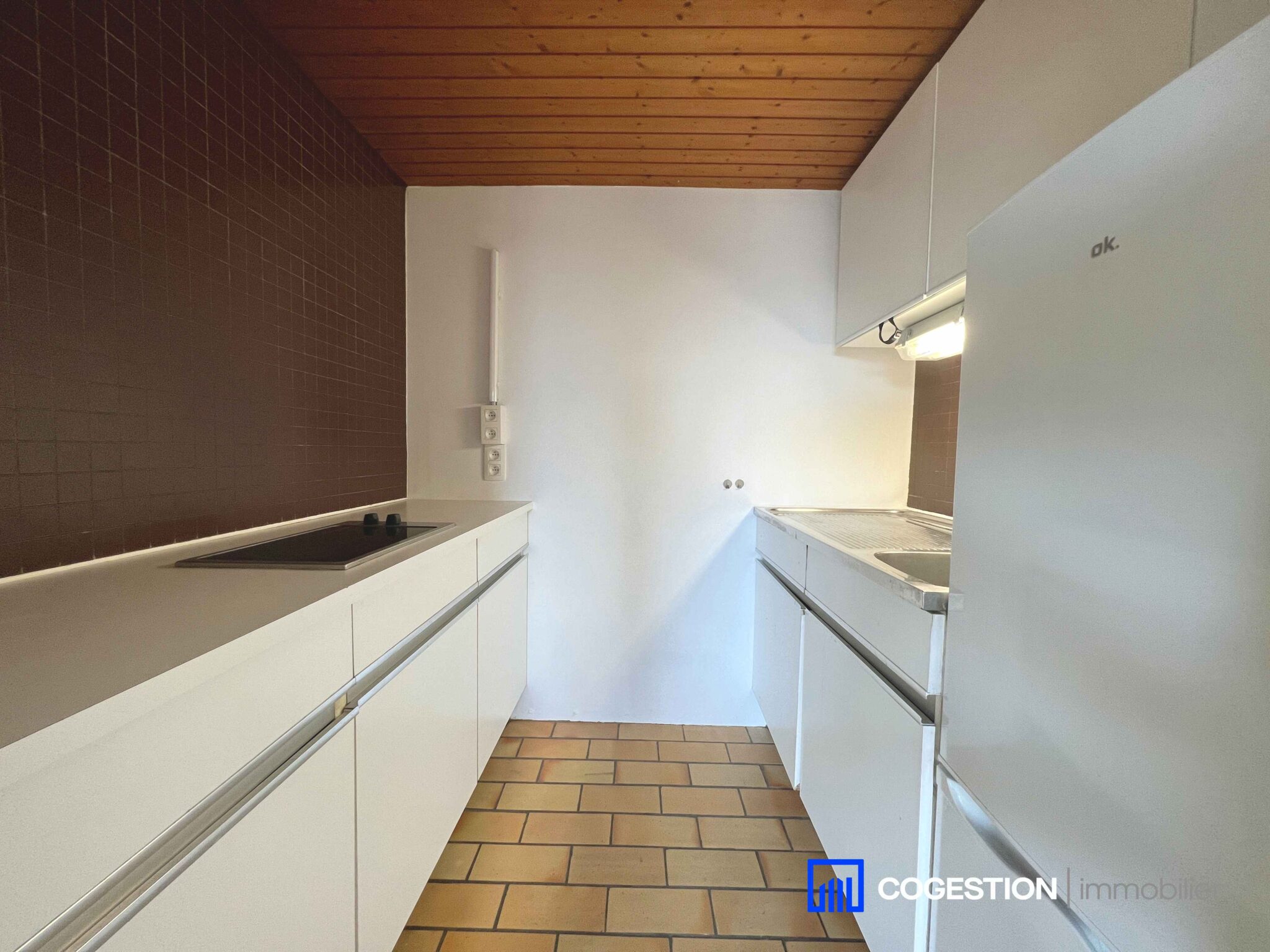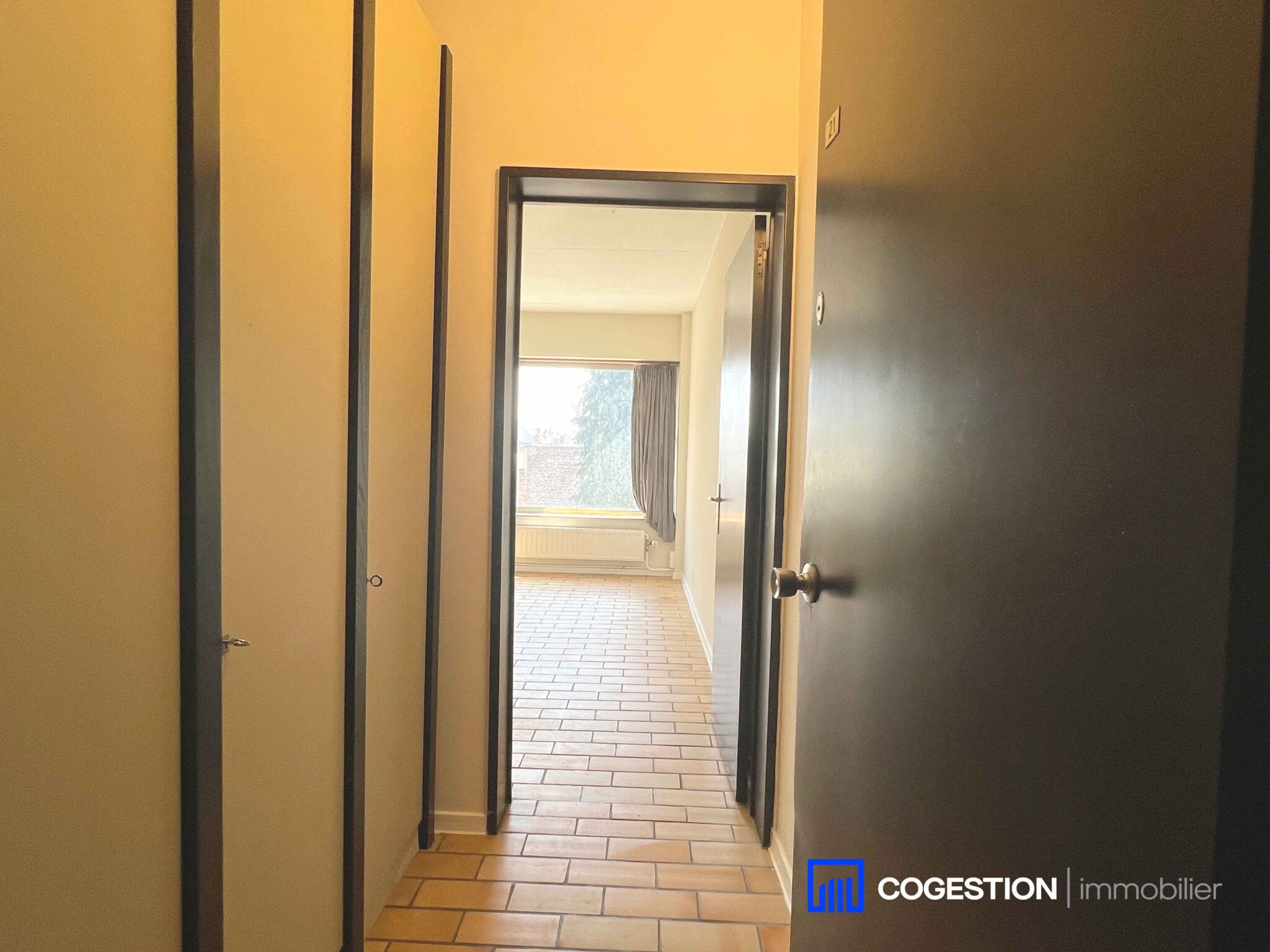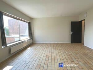 L’appartement se compose comme suit : un hall d’entrée avec placards encastrés, une grande pièce à vivre (+/- 27m²), une cuisine équipée, une salle de bain, une toilette séparée.